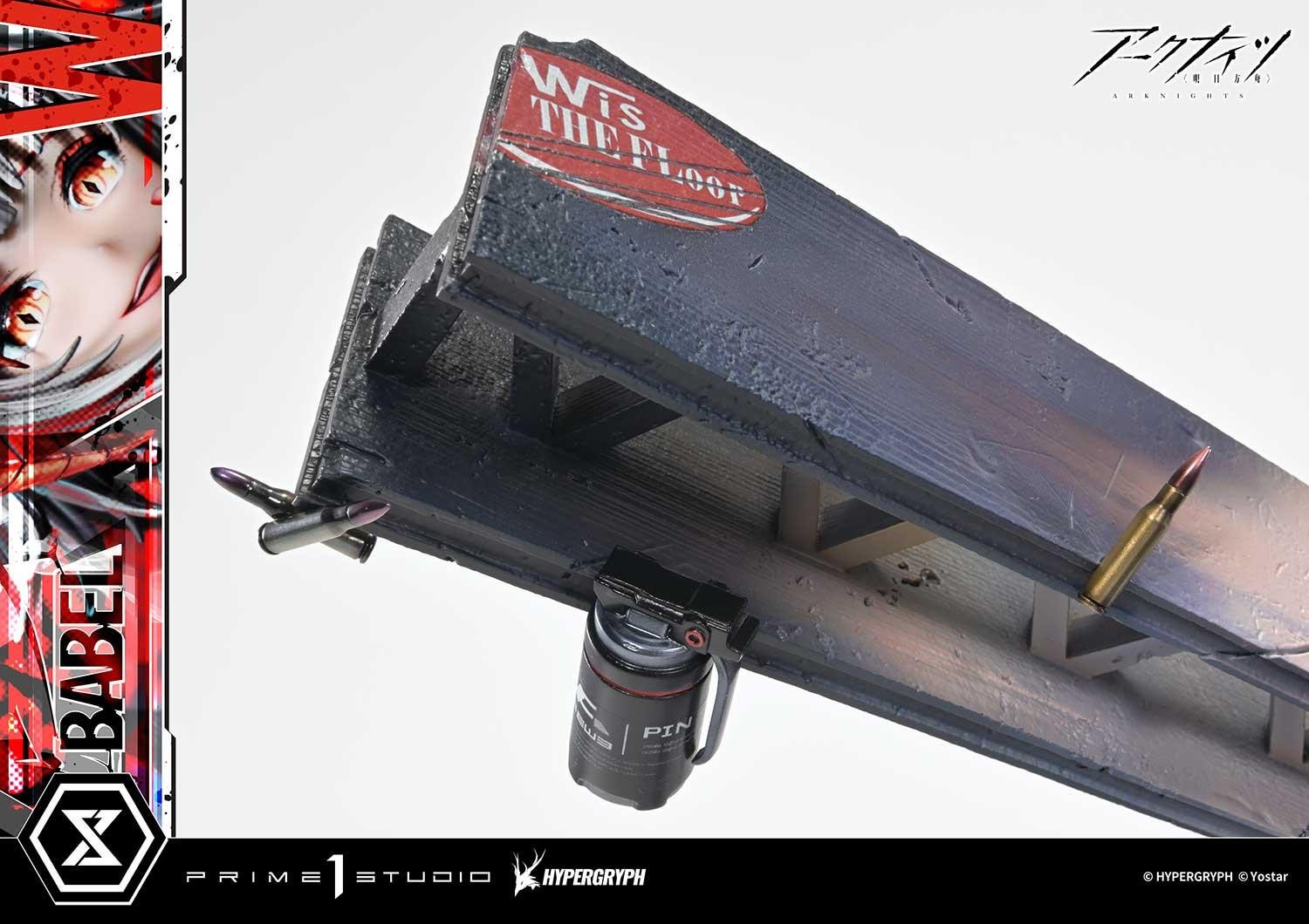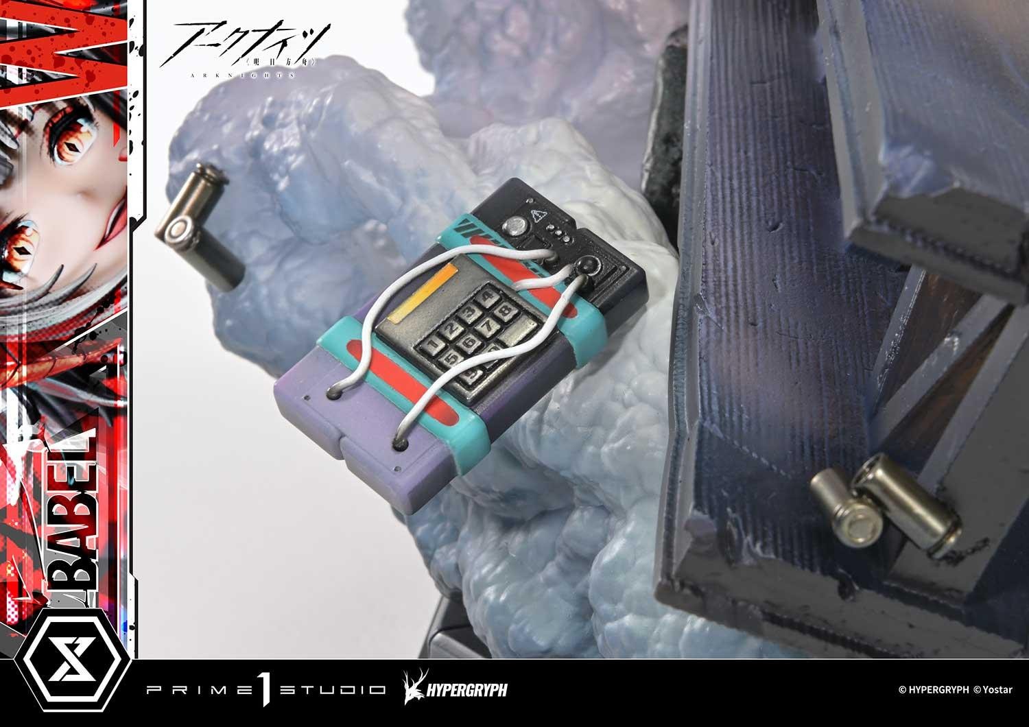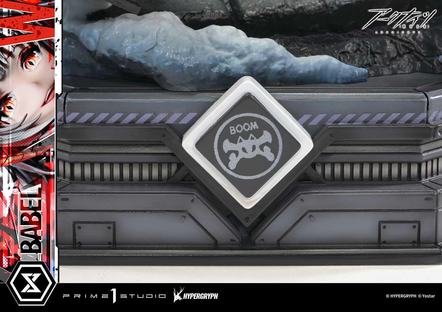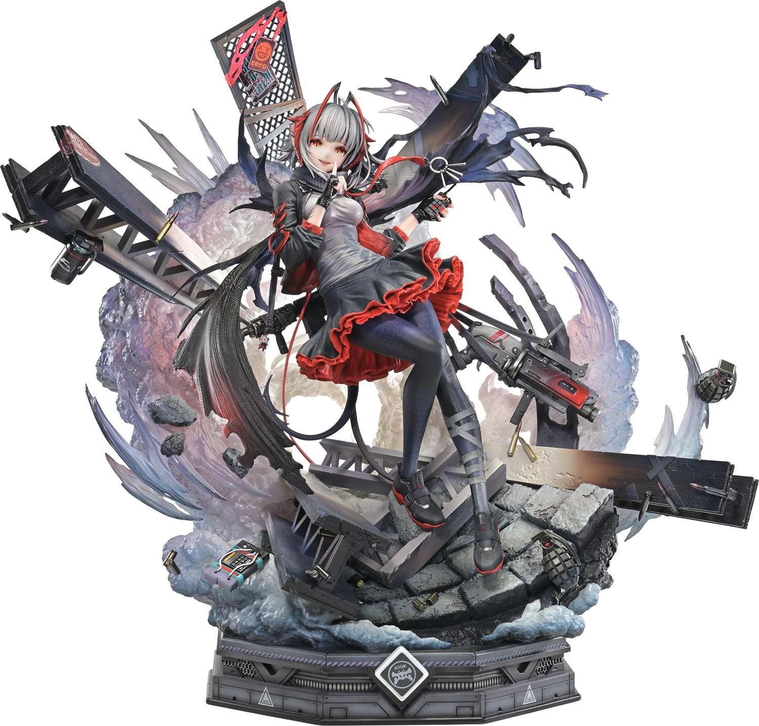 爆心で世界を嗤う、サルカズの榴弾射手。圧倒的なビジュアルが、鮮やかなイラストが、1/6スケールスタチューで蘇る!天災がもたらした謎多き鉱石「源石(オリジニウム)」の影響により、世界各地で鉱石病という病が発生。それにより現れた特異体質者たちを巡る戦いを描いた本格タワーディフェンスゲーム『アークナイツ』から、「W昇進2」がコンセプトマスターラインに登場。爆発により破壊されたステージの渦中で、いたずらな微笑みを浮かべるサルカズの榴弾射手・W。彼女の本質を表すかのような昇進2のビジュアルが、1/6スケールで表現された1体です。印象的な円形構図と浮遊感あるポージングを、立体ならではの奥行きあるレイアウトで演出。爆発を支配する者の存在感を際立たせました。火花を映して輝く瞳、楽し気にほころぶ口元、次の爆破を誘う、今にも動き出しそうな指先。各部の造形と彩色は、原画のエッセンスを丁寧に汲み取っています。フリルが揺らめくスカート、革のジャケットなど、衣装は素材感にこだわりつつ、爆炎の照り返しまで表現。装備した銃火器とそれにぶら下がるマスコット、そして手にした起爆装置なども緻密な仕上がりです。背景の爆発は、迫力を損なうことなくディスプレイに最適な造形にアレンジしています。テクスチャーとグラデーションを駆使し、空気の膨張と衝撃の余韻を再現した煙。デフォルメを効かせた鉄骨。彼女の戦術を想起させる手榴弾や爆弾。それらすべての組み合わせにより、鮮やかな破壊のイメージを生み出しています。さらに本ボーナス版には、「バベル」のロゴプレートも付属。彼女のアイデンティティを形成した、過ぎ去りし日々を象徴するスペシャルパーツです。精巧な立体表現で贈る、昇進2のW。観る者をスタンさせるコレクションピースです。